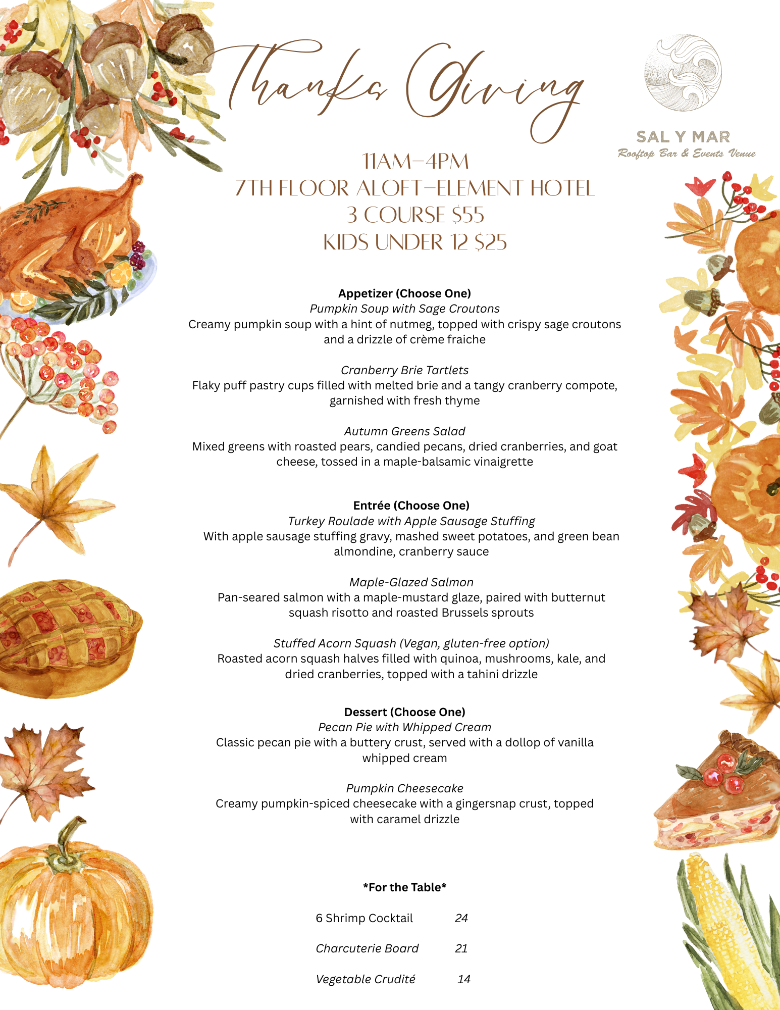 This Thanksgiving, Sal Y Mar Rooftop Bar invites guests to celebrate above the city skyline with a festive three-course prix fixe menu featuring the season’s best flavors and panoramic views of Midtown Tampa. Priced at $55 per adult, $25 for children ages 5-12, and free for kids under 5, the rooftop’s special holiday offering blends chef-crafted tradition with coastal sophistication.